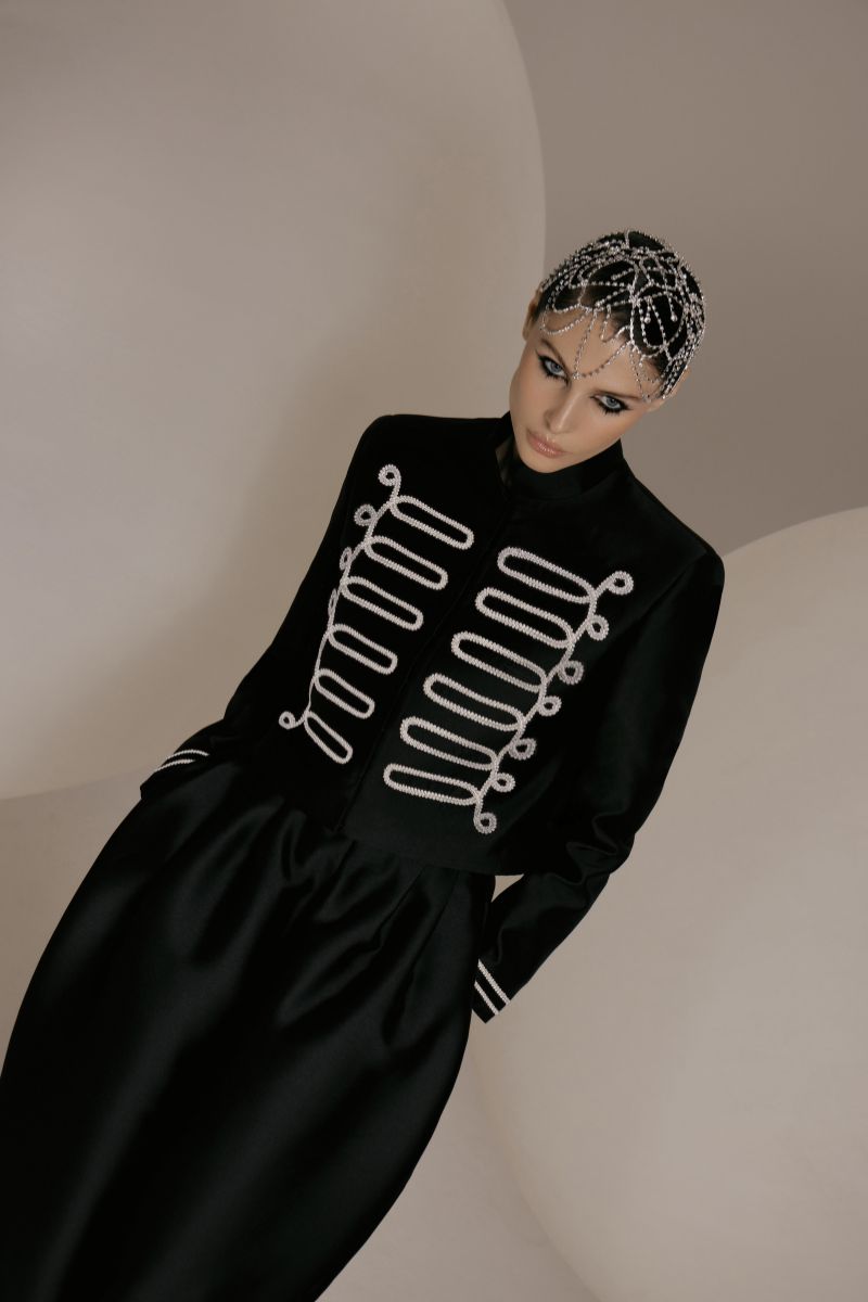Платье с корсетным лифом и открытой линией декольте формирует собранный, выверенный силуэт, акцентируя плечи и талию. Посадка создаёт ощущение поддержки и контроля, сохраняя визуальную лёгкость и чистоту линий. Жаккардовый лиф с графичным рисунком задаёт структуру и характер образа, мягко переходя в плавно ниспадающую юбку. Контраст плотной формы и текучести усиливает динамику и добавляет глубину силуэту. Жаккард RED ROSE хорошо держит форму и работает с цветом и светом, подчёркивая архитектурность изделия. Материал придаёт образу цельность и завершённость без излишней декоративности.