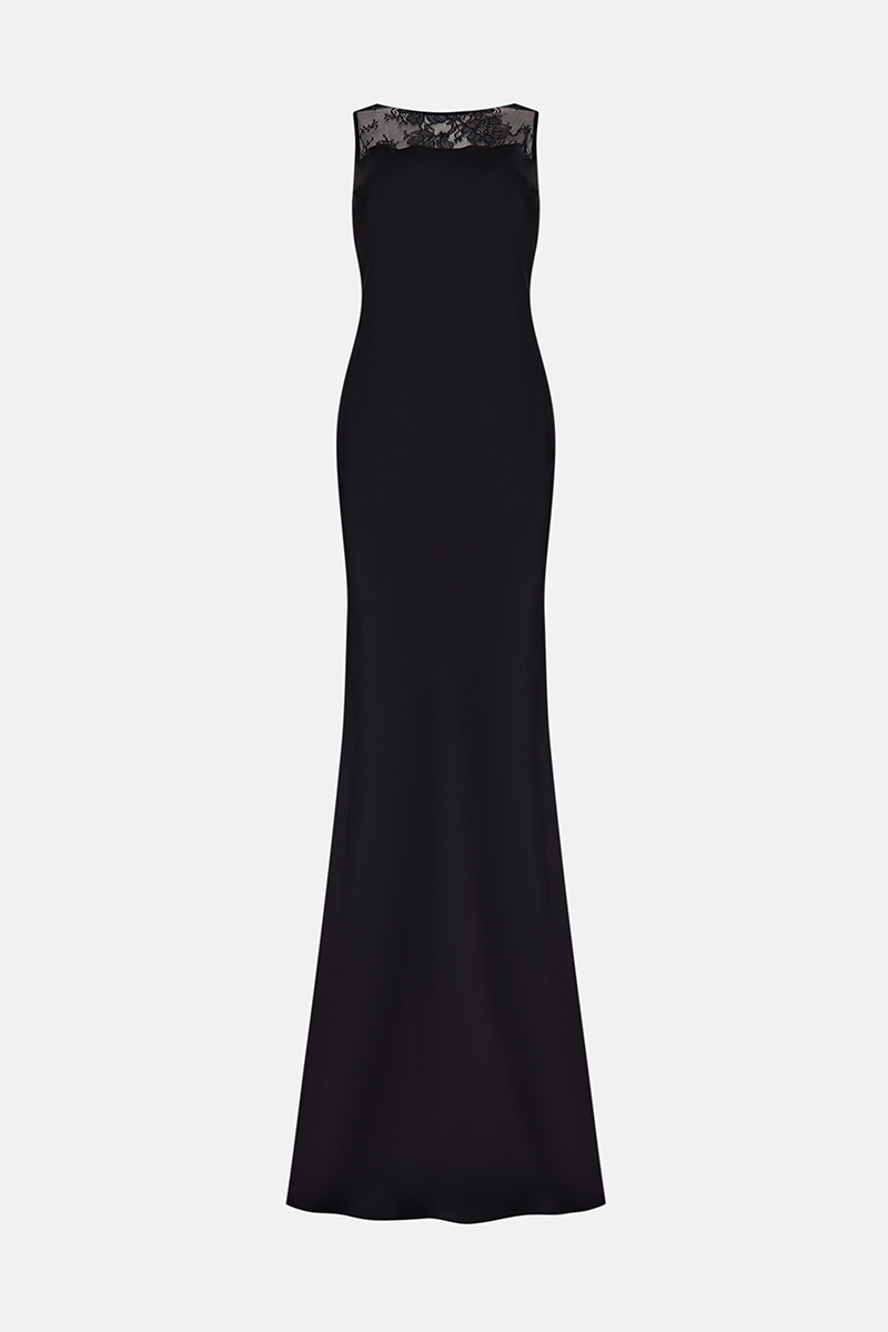 Платье приталенного силуэта с мягким прилеганием по фигуре и плавным расширением к низу, формирующим вытянутую, собранную линию. Закрытая линия декольте контрастирует с глубоко открытой спиной, оформленной полупрозрачным кружевом, добавляя образу напряжение и точность. Лаконичный крой подчёркивает чистоту формы, не перегружая её деталями. Вискозная ткань гладко ложится по телу, создаёт ровное скольжение и деликатный матовый блеск. Работает как цельный, выверенный образ, в котором акцент смещён на линию спины и силуэт.